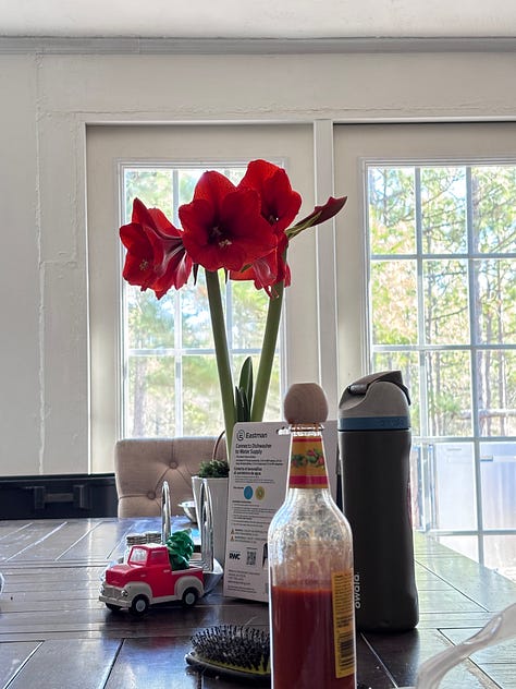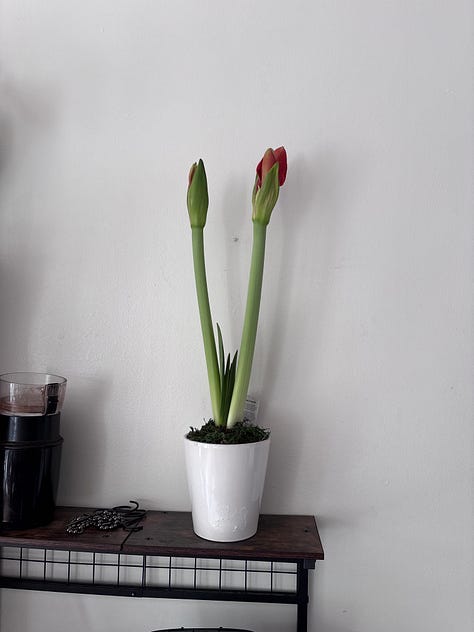Meanwhile, the amaryllis on my table is blooming. It is beautiful. It started opening up last week, and each day it’s a little more spectacular. It likes its new home just fine, and when I look at it I feel a whisper of hope… maybe I can bloom too.