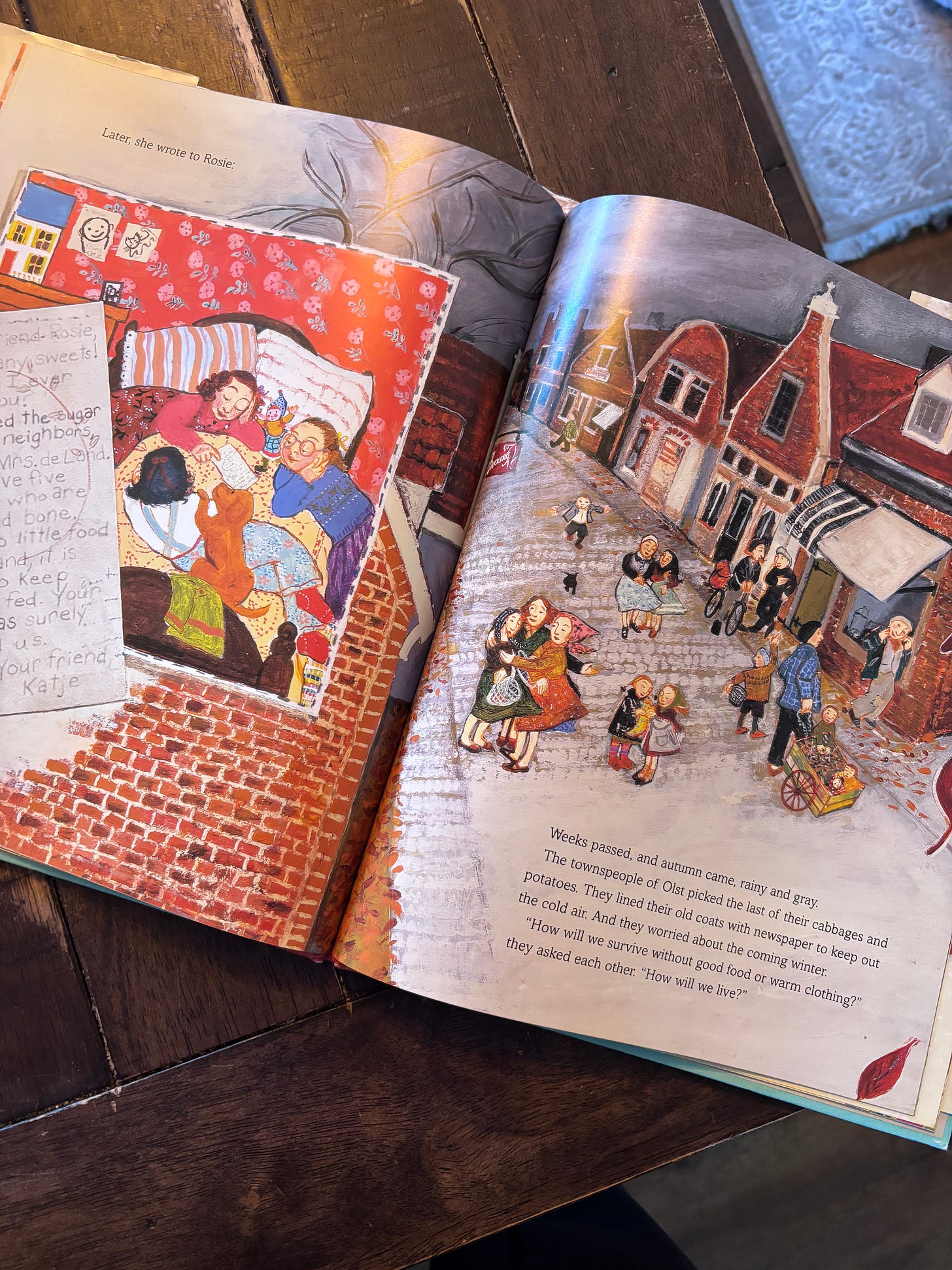 One good thing about moving is that you get to reorganize your bookshelves and all the poor categorizations you made the first go round can be somewhat corrected. There are just books that don’t belong with other books, and I like to try to group things in a way that makes at least some sense. We now have an entire shelf devoted to animal focused middle grade fiction1, which is as it should be. Even with all that, I couldn’t find the book I wanted to share this week, so as I made another cup of tea because I was cold, I thought of a book that I first found a few years ago at the library, Boxes for Katje by Candace Fleming, illustrated by Stacey Dressen-McQueen. This is the story of a young girl in post WWII Holland, and her pen pal friendship with an American friend. Katje’s village of Olst is struggling, and a Children’s Aid society box that begins as a small treat and a letter eventually ends with one town supporting another small town, oceans apart. It is a story of people seeing other people. So often we forget that we didn’t really do anything to not be the starving people in a war torn country. We could be those people still. If we live in relative plenty how do we remember the people who don’t? This book reminds me to be grateful for cabbages and potatoes, and to not take my sugar and chocolate for granted. It is filled with joyful illustrations of people who share the nothing they have, and still plant tulip bulbs. It’s based on a true story, and part of the note in the back of the book reads,